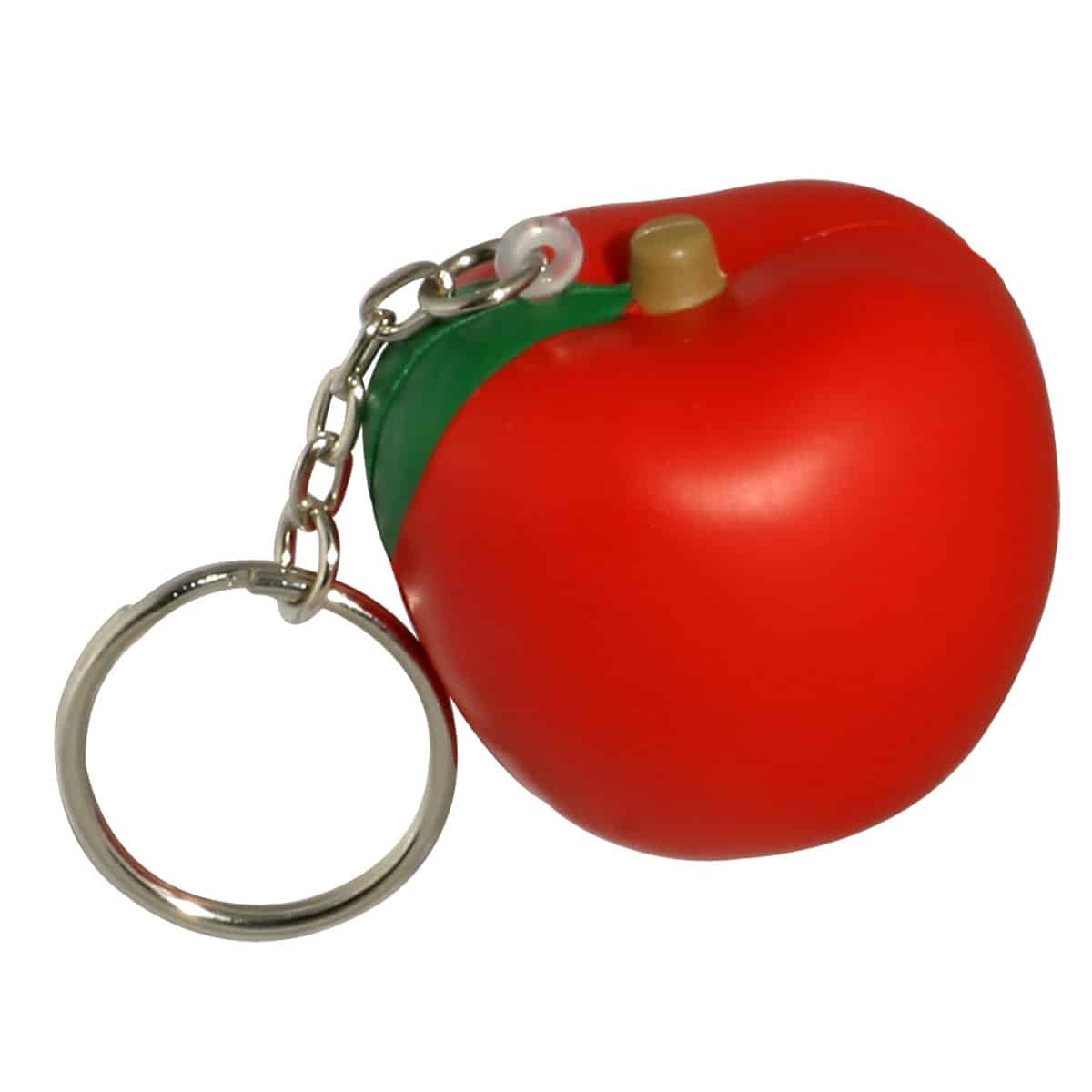 Apple Shaped Polyurethane Stress Reliever Key Chain. Complies with ASTM, CCPSA, CPSIA, Prop 65. 1.625″ H x 1.75″ Diameter
